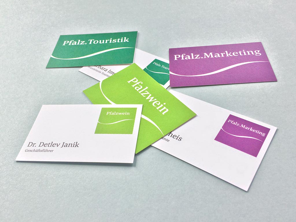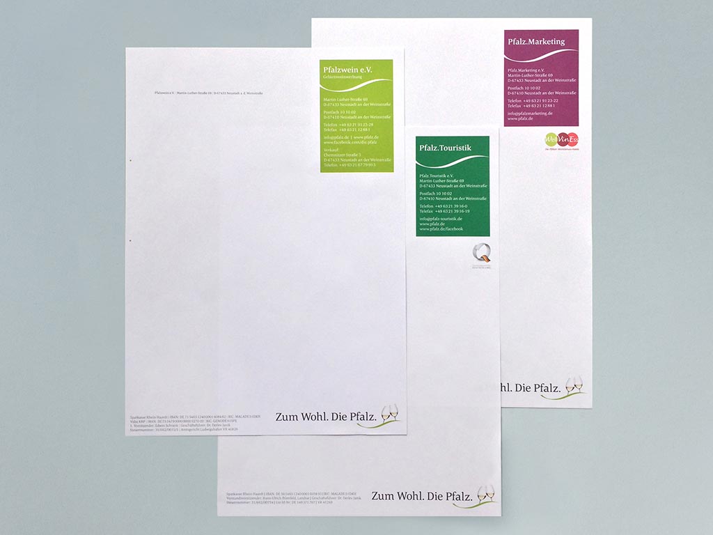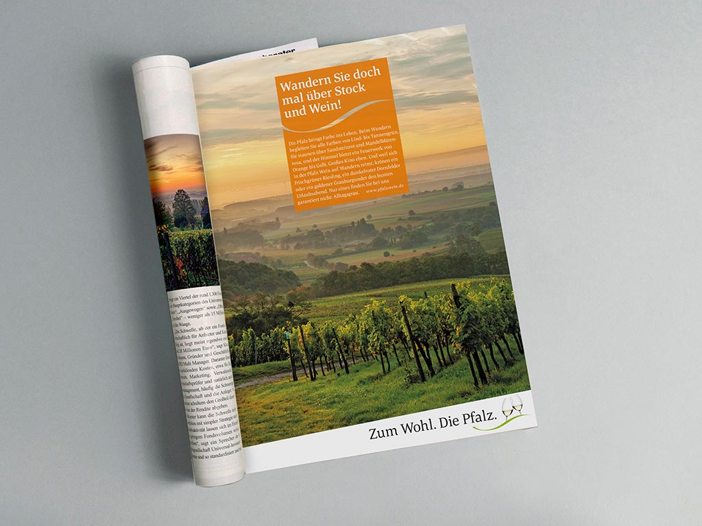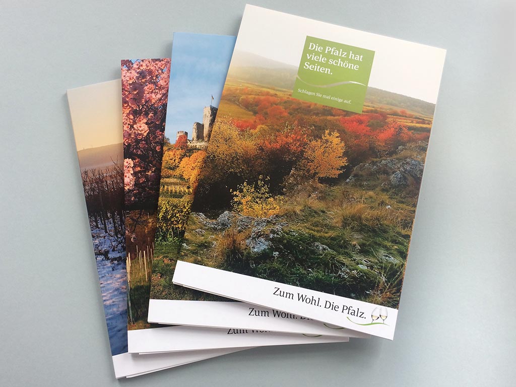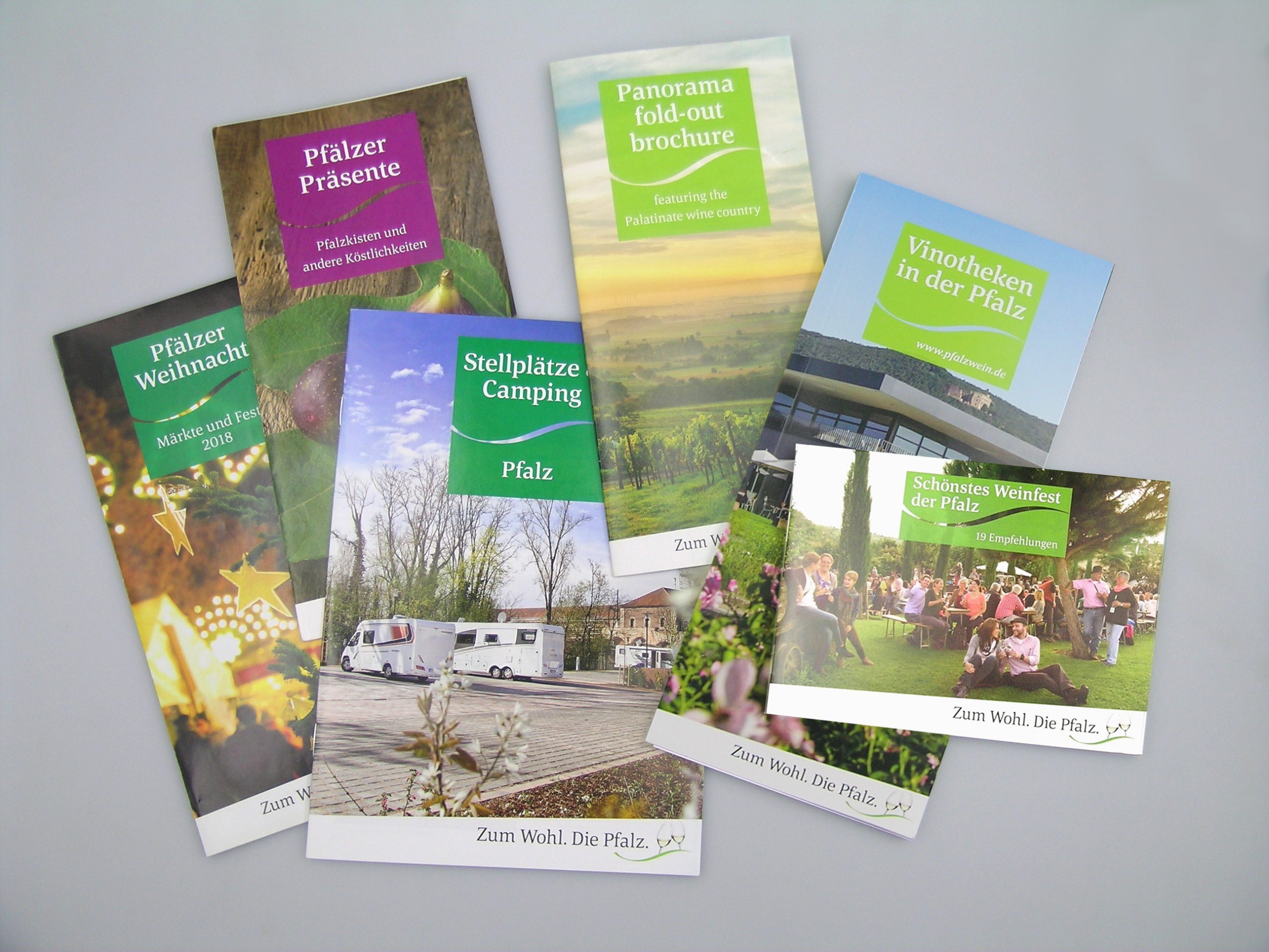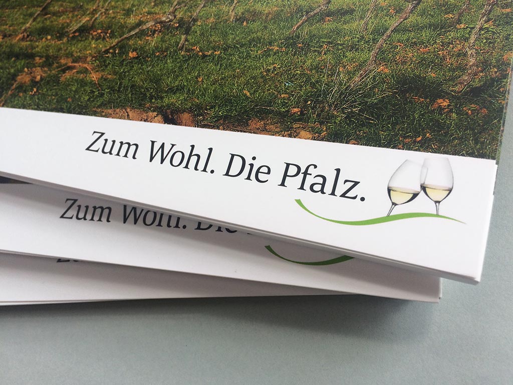 Die Pfalz ist eines der bekanntesten deutschen Weinanbaugebiete – nicht zuletzt wegen ihrer Gebietsweinwerbung, die die Region, ihre Rebsorten, die Weingüter und die damit verbundenen touristischen Attraktionen immer wieder neu präsentiert. Um bei der Vielfalt an Publikationen einen einheitlichen Gestaltungsauftritt sicherzustellen, war die Aufgabe ein neues Corporate Design zu entwickeln. Der neue Auftritt mit aktualisiertem Logo verleiht dem „Pfälzer Wein“ einen aufgeräumten und zeitgemäßen Look, der den Bildern Raum lässt und Genuss vermittelt.